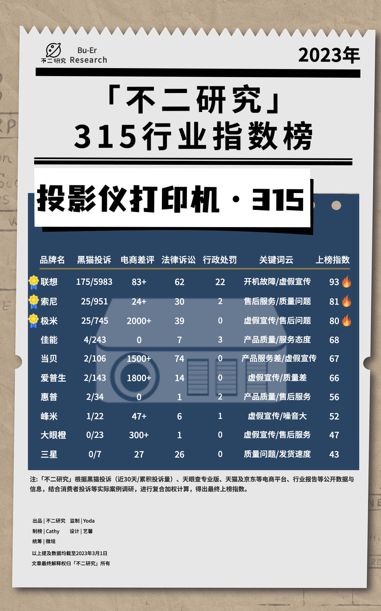在投影仪打印机品类,「不二研究」调研了近50个活跃品牌样本,其中联想、索尼、极米、佳能、当贝、爱普生、惠普、峰米、大眼橙、三星10个品牌的上榜指数较高。以上榜指数最高的联想投影仪为例,其最严重的问题为开机故障和虚假宣传。