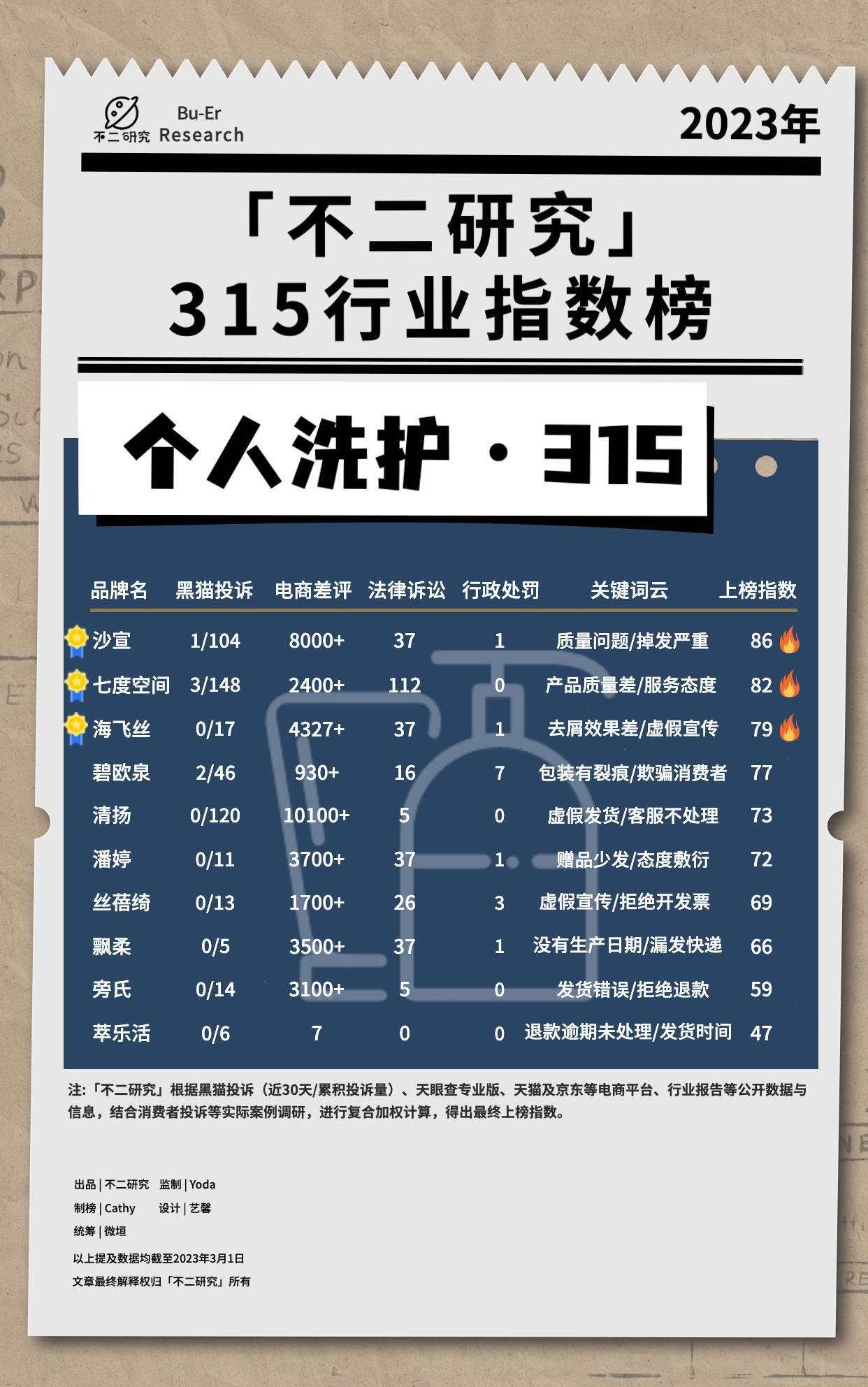 在洗护品类,「不二研究」调研了近50个活跃品牌样本,其中沙宣、七度空间、海飞丝、碧欧泉、清扬、潘婷、丝蓓绮、飘柔、旁氏、萃乐活10个品牌的上榜指数较高。以上榜指数最高的沙宣为例,其最严重的问题为产品质量不合格和商家服务态度差。