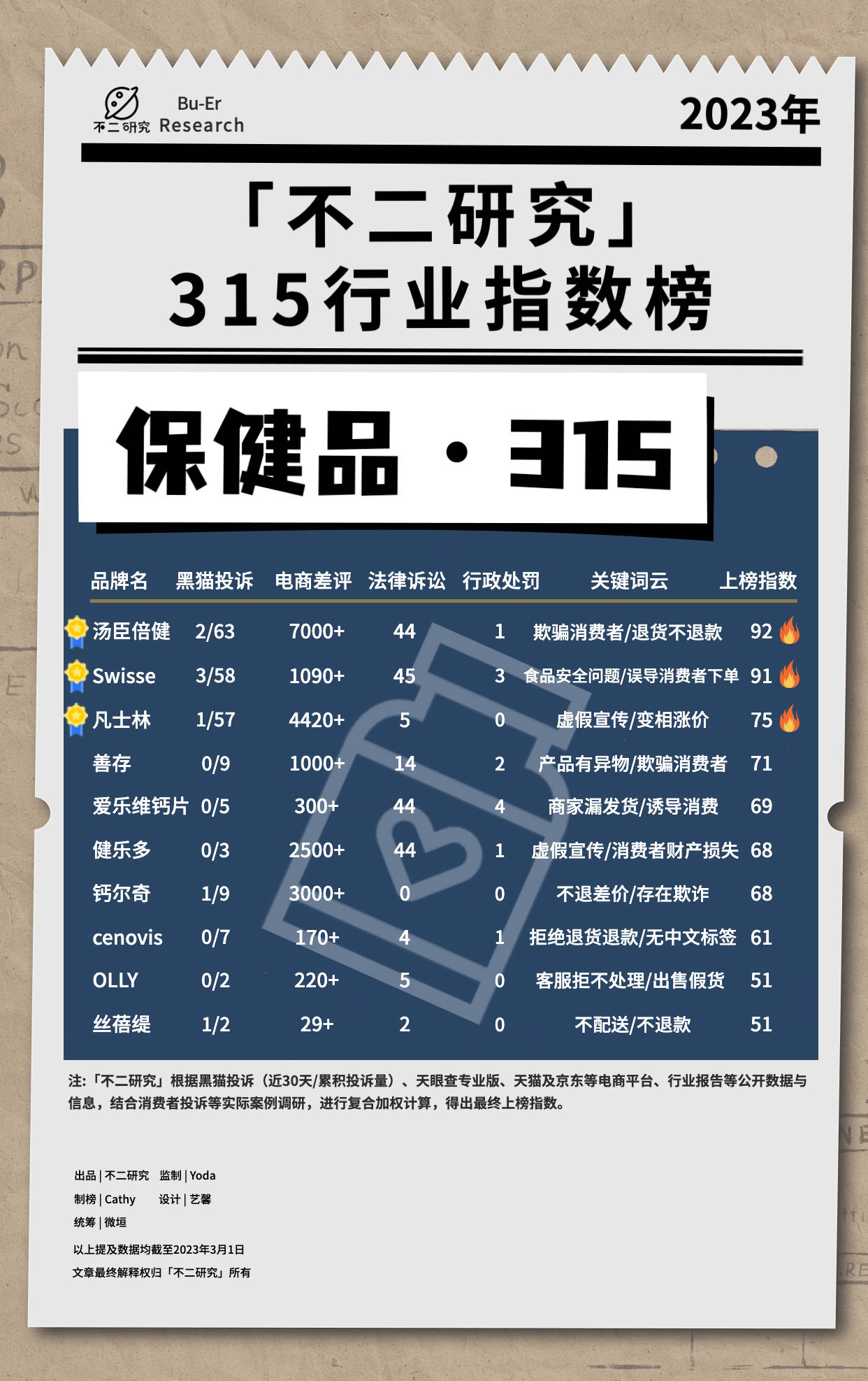 在保健食品类,「不二研究」调研了近50个活跃品牌样本,其中汤臣倍健、Swisse、凡士林、善存、爱乐维钙片、健乐多、钙尔奇、cenovis维生素、OLLY、丝蓓缇10个品牌的上榜指数较高。以上榜指数最高的汤臣倍健为例,其最严重的问题为欺骗消费者和退货不退款。