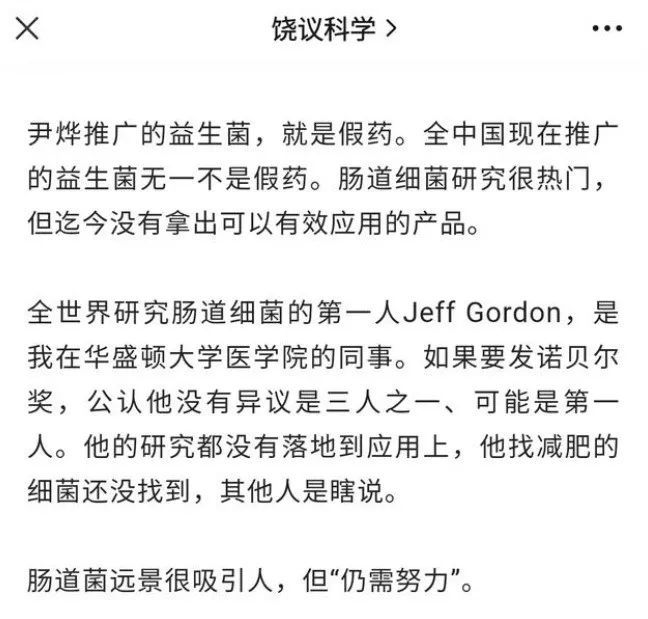 此外,饶毅在7月26日的文中指出,“尹烨推广的益生菌,就是假药。全中国现在推广的益生菌无一不是假药。肠道细菌研究很热门,但迄今没有拿出可以有效应用的产品”。