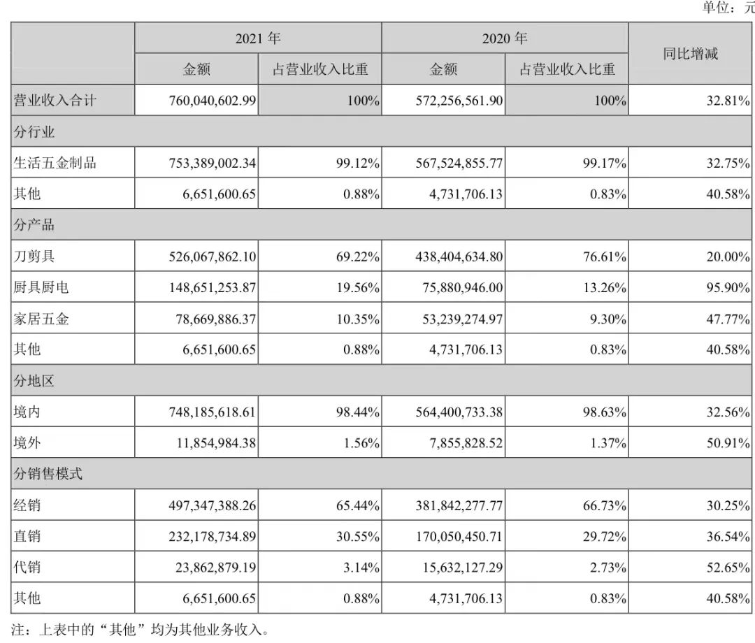 在产品拓展方面,2021年张小泉成立了厨具厨电事业部集群以及家居五金事业部集群,厨具厨电、家居五金两大新产品类目共计实现销售收入2.27亿元,占公司总体营业收入的29.91%,较上年同期增长76.05%。