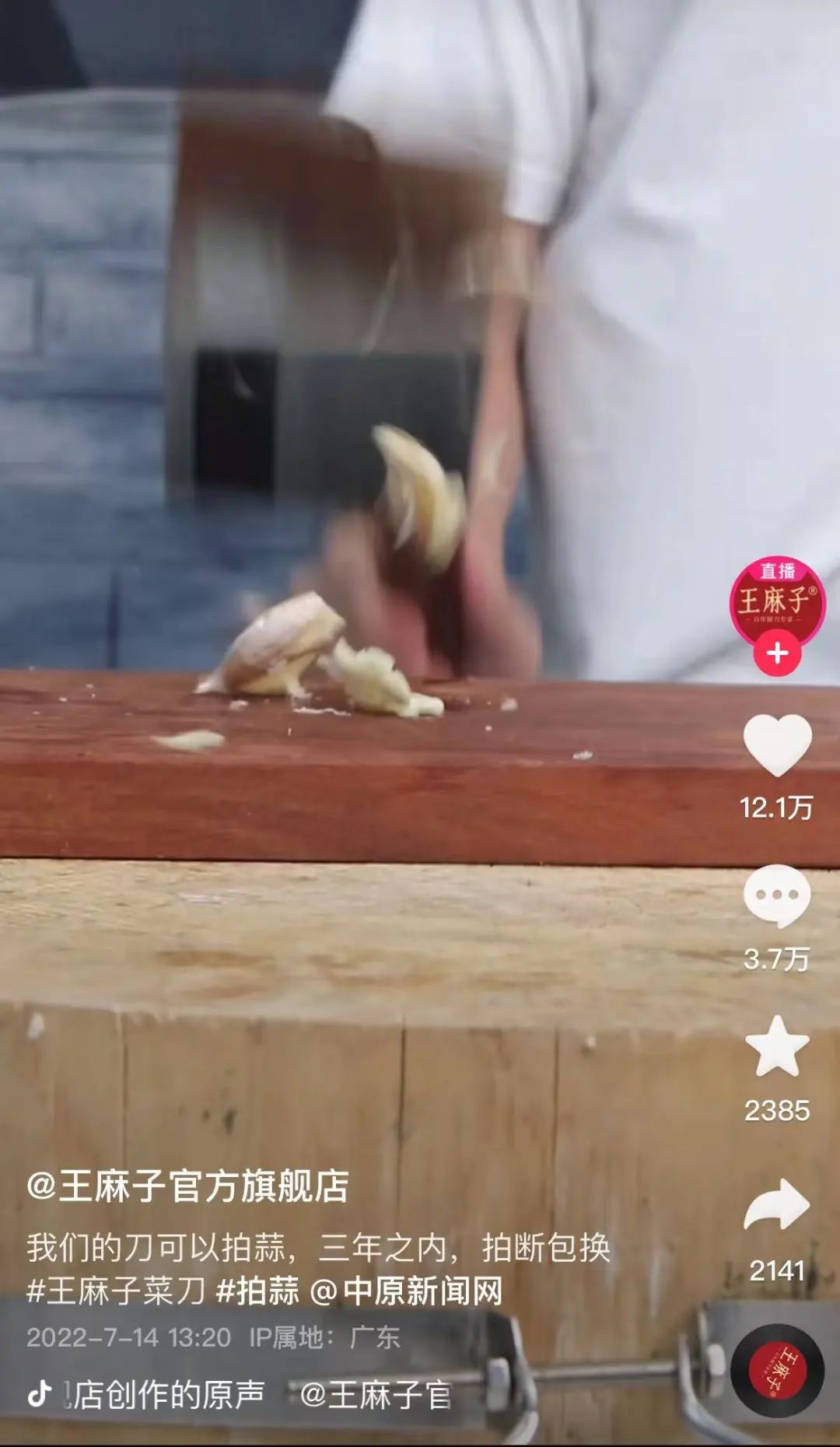 另一个老字号菜刀王麻子趁机火上添油,多次在直播间上演“刀背拍蒜”的营销场面,就差直接喊出来:张小泉,你装什么“蒜”!