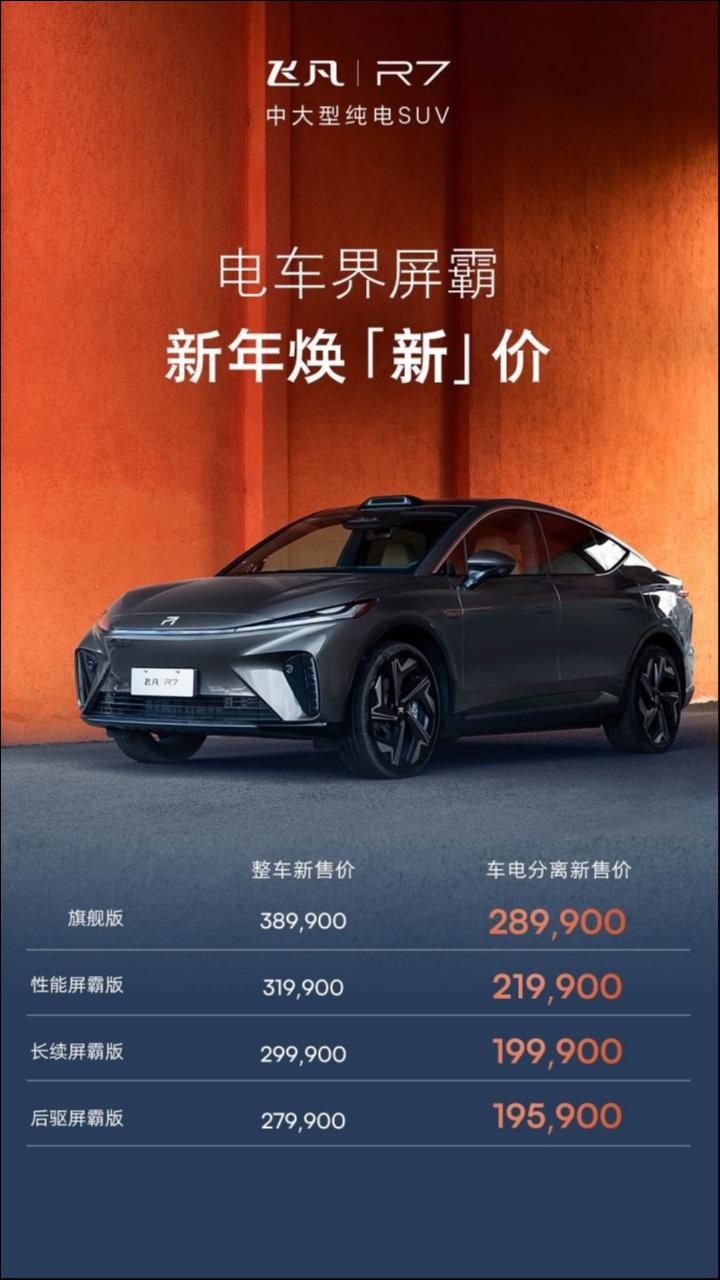 近日,飞凡汽车正式宣布,中大型纯电SUV飞凡R7启动产品价值体系调整,发布全新屏霸版产品线,车电分离畅享价调整至19.59万元起,成为唯一进入20万元内的中大型纯电SUV。同时,屏霸版产品线全面开放包含补能场景、智驾场景、配置场景在内的多项选择方案,从买车到用车提供更自由灵活选择空间。