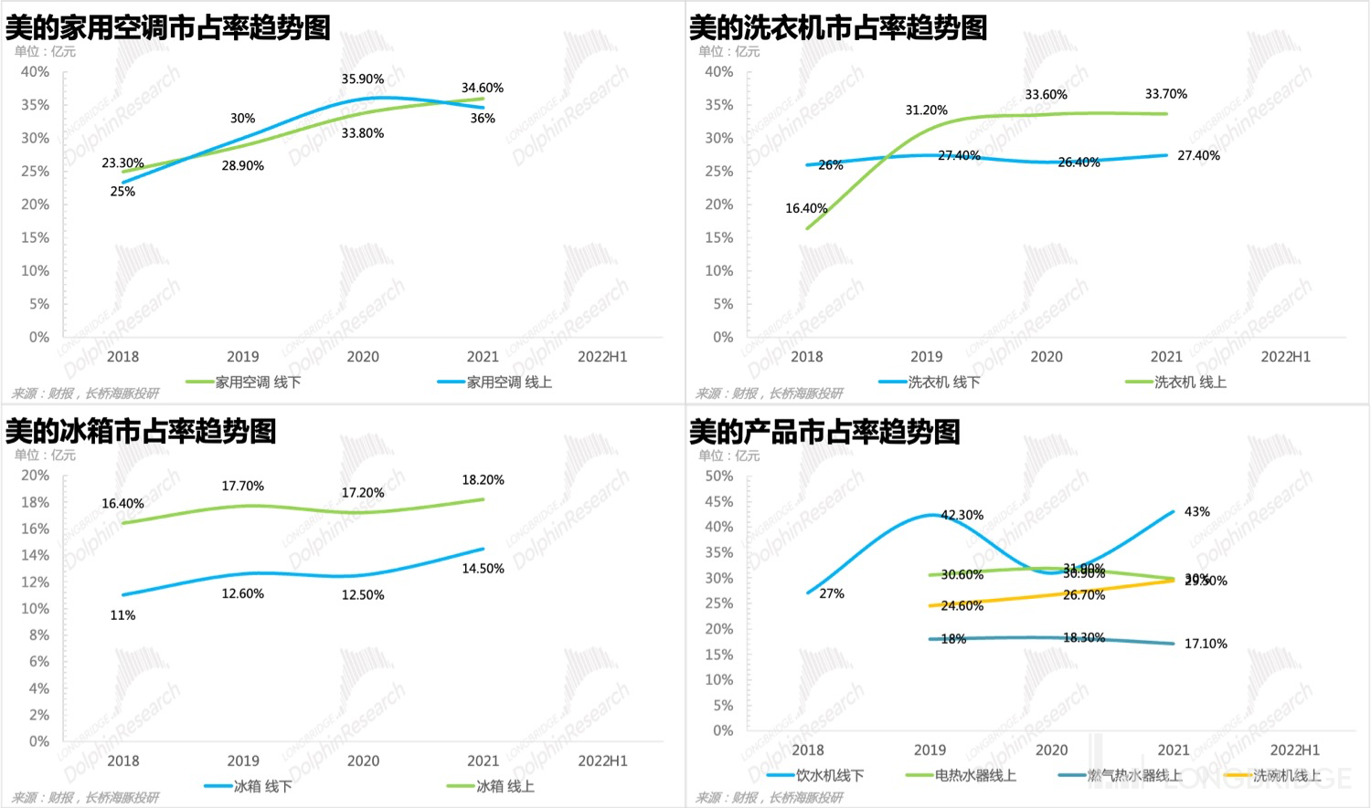 2022 年上半年在需求本身不足的情况下,疫情又造成了线下消费场景缺失,并且也让大家对未来的经济产生了担忧,压抑了消费意愿,最终导致上半年电器销量明显下滑,但苦中作乐的是,美的在大多数品类中依旧保持了高市占率,当然我们也可以从中看出市占率增长放缓,靠抢别人份额维持增长是越来越难了;