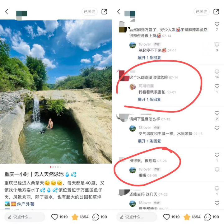 另外有一个博主,则经常驱车到距离重庆市区 1-2 个小时的郊区,找小溪、小河露营。博主在文案中经常提到“可以下水”,但评论中则指出这些河流会有暗流,其实并不安全。