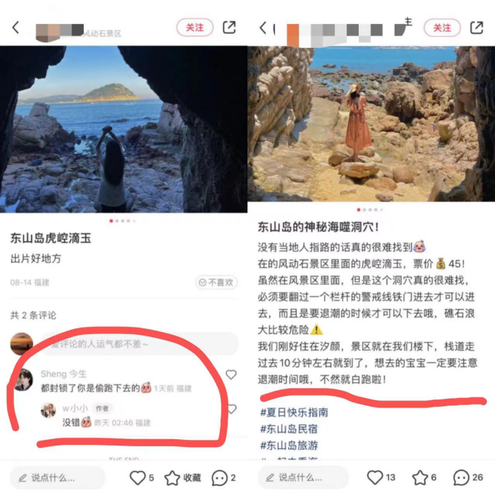 小红书上,有详细的帖子描述具体方位,这并不是一个被开发的景点,因为涨潮时就会被淹没,只能在保安的允许下进去看几分钟。同时,就有另外的帖子指导,一旦保安不允许游客下去,游客能够从什么道路继续绕过保安的监管,下到洞穴里拍照。