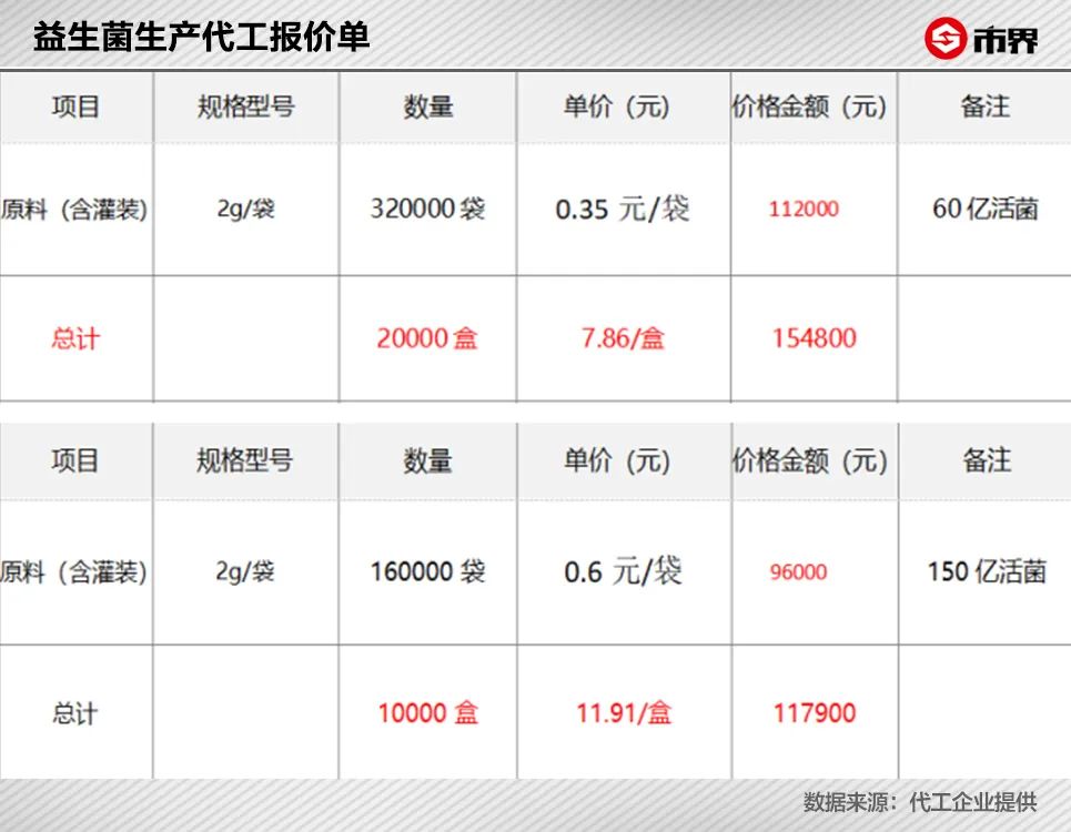 华大集团一款150亿活菌数量的“益舒”在京东旗舰店的销售单价为188元/盒。代工企业根据这款“益舒”的原料组成,在不知道华大集团具体配比的情况下,给出了一个市场报价。比如:150亿活菌数量报出的益生菌产品单价约为11.91元/盒,60亿活菌数量单价约为7.86元/盒,另一家益生菌代工企业给出的报价则分别约为9.4元/盒和6.2元/盒。