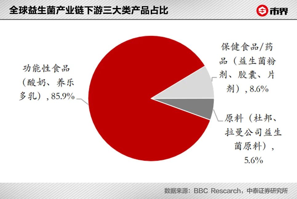 按照益生菌产品形态看,包含功能性食品(酸奶、乳酸菌饮料)、保健食品及药品(益生菌补充剂如粉剂、胶囊等)、益生菌原料(发酵果汁、酸奶的原料)。其中酸奶、养乐多所在的功能性食品占据了益生菌86%的市场。