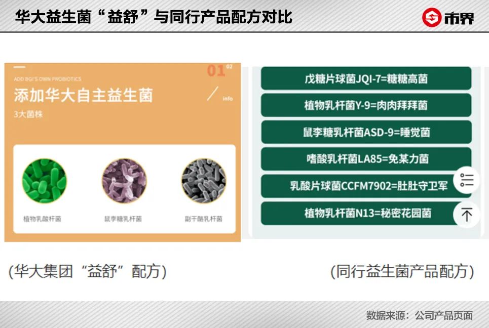 从华大“优美达”系列益生菌产品来看,是由广州正当年生物科技有限公司代工,其中只有部分产品添加了华大集团自主研发的专利菌株。从产品配方标注便可见一二,比如华大集团主打的一款肠胃益生菌“益舒”,声称添加了华大自主益生菌的3大菌株——副干酪乳杆菌、植物乳杆菌、鼠李糖乳杆菌。