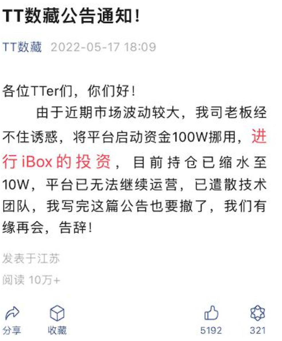 图 | 先前TT数藏爆出CEO挪用资金导致平台无法运营的新闻