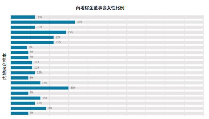 值得一提的是,《报告》同时显示,内地房企普遍面临董事会男女比例不均的问题,女性占比仍在少数,甚至缺乏女性高管的身影。31家获MSCI评级的内地房企的样本中,约35%的房企没有女性高管。尽管其余的房企在董事会组成上包含女性,但是平均占比却只有16%,远低于国际30%的标准。