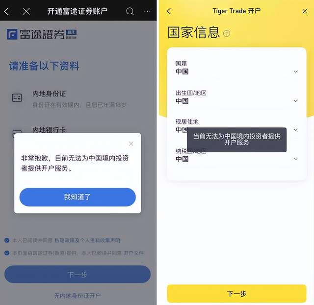 深燃测试发现,在老虎国际、富途牛牛APP,用内地手机号可以注册,但无法开户。两个APP的开户页面都显示目前“无法为中国境内投资者提供开户服务”。老用户的日常交易,两个APP不受影响。