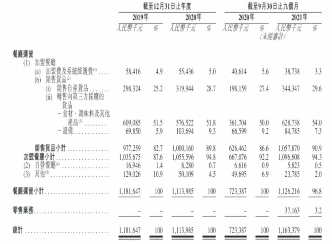 数据显示,蜜雪冰城2021年的103.51亿元营收中,近7成来自于以固体饮料、风味饮料浓浆及果酱为主的食材销售,而杨国福的“麻辣烫生意”,90%以上的收入来自于向旗下数千家加盟商销售食材、调味料以及设备等产品,加盟费及系统维护费合计占比仅为5%左右。