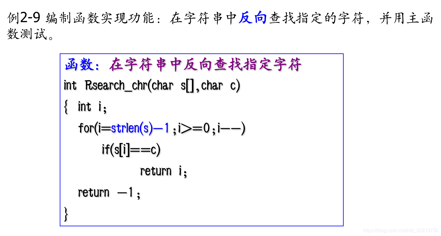 strchr(str,ch)标准字符查找函数:正向在字符串str中查找字符ch,若ch存在则返回其在字符串中首次出现的地址,否则返回NULL。