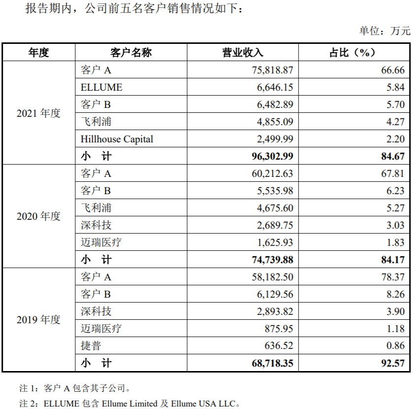 美好医疗呼吸机组件产品的主要客户为“客户A”。2019年-2021年,美好医疗来自“客户A”的直接及间接订单销售收入分别为6.1亿元、6.29亿元以及7.81亿元,占总营收的比重分别为82.27%、70.84%以及68.85%。