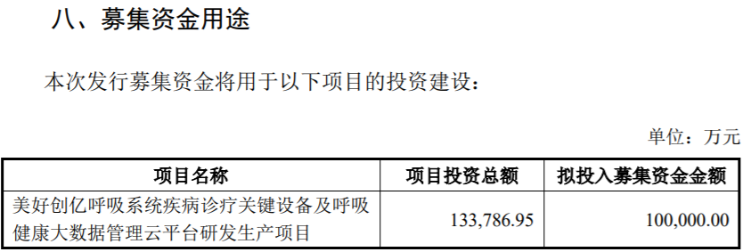 《招股书》显示,美好医疗IPO募资总额约为13.57亿元,扣除1.33亿元的发行费用后,募资净额约12.25亿元,其中10亿元用于美好创亿呼吸系统疾病诊疗关键设备及呼吸健康大数据管理云平台研发生产项目(下文简称为“美好创亿研发生产项目”)。