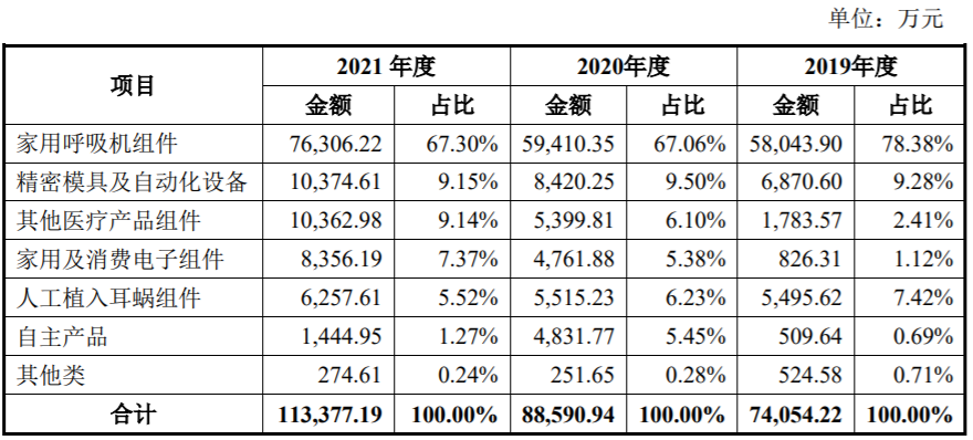 《招股书》显示,2019年-2021年,家用呼吸机组件业务分别为美好医疗贡献了78.38%、67.06%以及67.30%的营收,是公司重要的营收支柱。