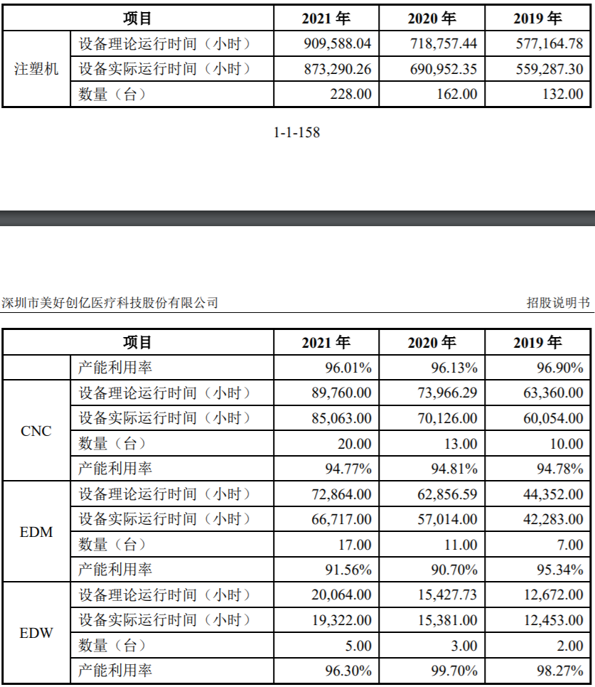 《招股书》显示,2021年,美好医疗注塑机、CNC以及EDM的产能利用率分别为96.01%、94.77%、91.56%,已多年没有增长。与此同时,美好医疗家用呼吸机组件的产销率为92.09%,相比前两年,甚至有所下降。