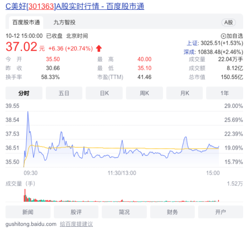 2022年10月12日,美好医疗登陆深交所创业板,发行价为30.66元/股。上市首日,美好医疗的股价上涨20.74%,报收37.02元/股。