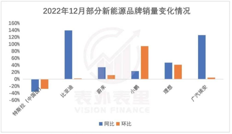 从国内新能源汽车市场的竞争看,行业正加速内卷。“蔚小理”、比亚迪之外,传统车企在新能源汽车布局也在2022年取得成效。吉利极氪、广汽埃安等传统车企旗下的新能源汽车品牌都已经成长为行业不可忽视的力量。2022年,广汽埃安交付量已经超过特斯拉中国的一半,但其仍然保持着100%的超高增速。