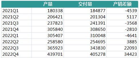 根据特斯拉官网数据,2022年二季度以前的大部分季度里,特斯拉产量高于交付量。但自从2022年二季度开始,特斯拉产量持续高于交付量,并且产销差额由二季度的3885辆扩大到4季度的3.4万辆。