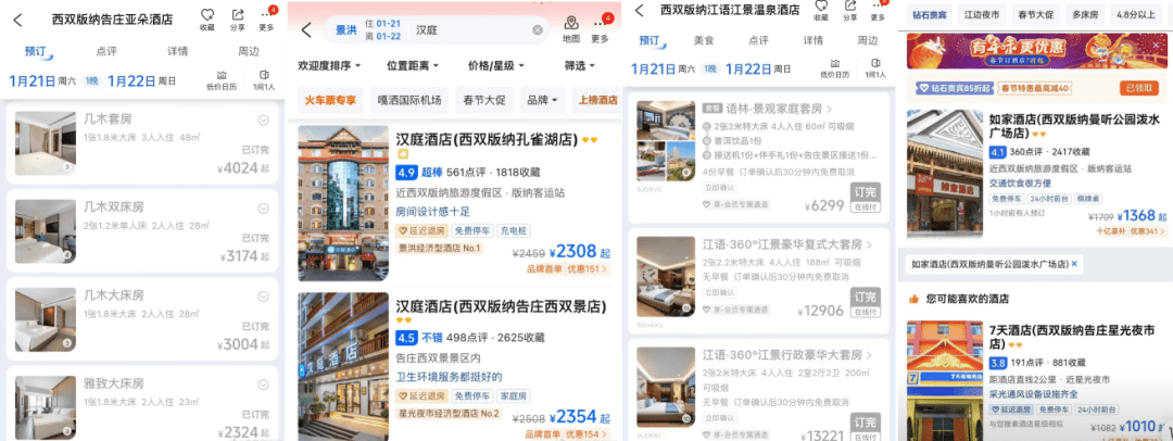 春节假期期间,作为今年春节游的“大热选手”西双版纳经济型酒店的价格已经突破千元,以除夕当天入住价格为例,据携程APP,汉庭酒店(西双版纳告庄西双景店)当晚的最低价格要2189元;7天酒店(西双版纳告庄星光夜市店)当晚最低价格要1066元,且已售罄;锦江之星酒店(西双版纳景洪泼水广场店) 当晚最低价格要1191元。而这些酒店淡季时,最低价格141元/晚到207元/晚之间不等。这意味着,春节期间的这些经济型酒店的价格至少涨了超10倍。