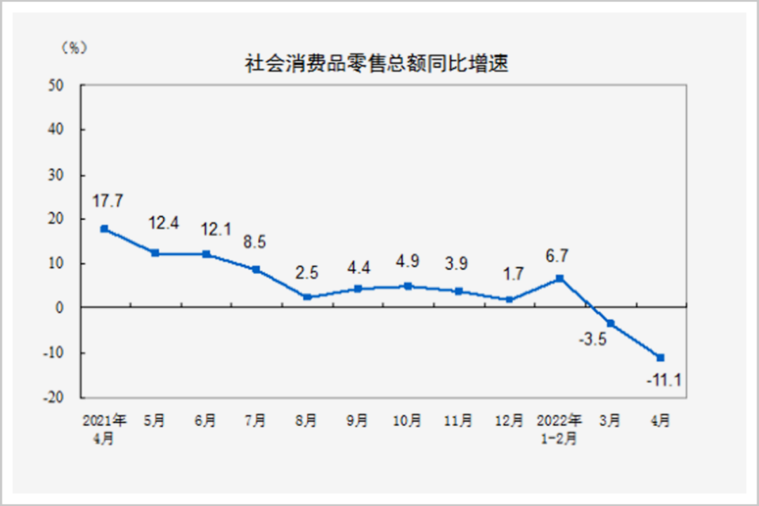 国家统计局数据显示,今年前四个月,我国社会消费品零售总额下降0.5%。
