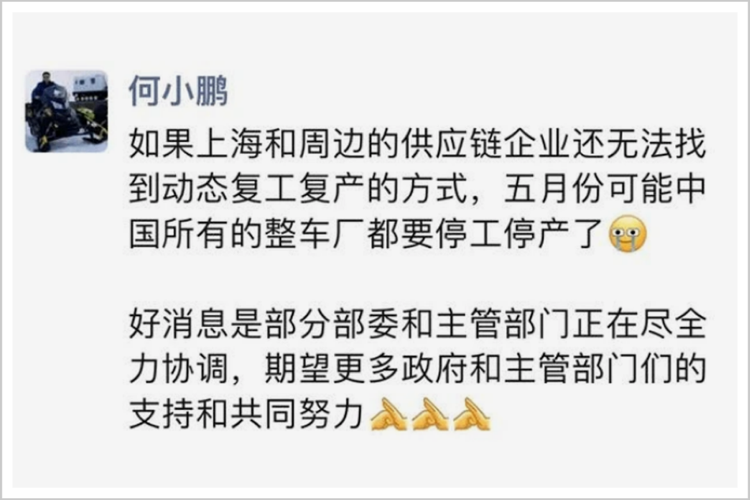 4月中旬,小鹏汽车创始人何小鹏在朋友圈喊话:上海供应链再不复产,5月全国车厂都得停工!