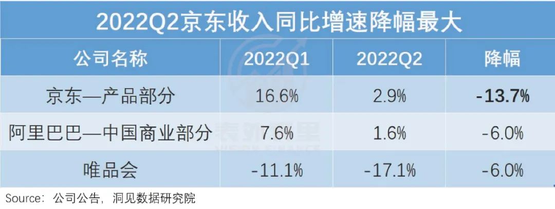 而更严峻的,是核心产品部分的收入情况。如下图,2022Q2,相比阿里、唯品会,京东的核心产品收入同比增速,下滑最明显。