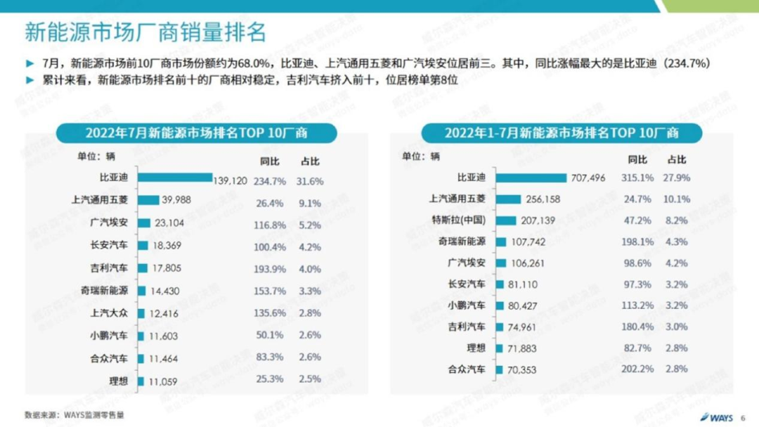 而据乘联会数据,对于造车新势力而言, 躬身入局新能源的传统车企是碾压式的存在。 今年7月,比亚迪销量达13.9万辆,同比增幅234.7%,市场占比31.6%,因手握电池等核心技术,市场表现一骑绝尘;上汽、广汽、长安、吉利、奇瑞等传统车企修炼的“小号”也都牢牢占据了TOP 10榜单前列。