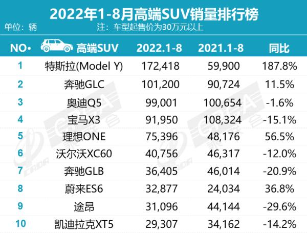 乘联会数据显示,2022年1-8月的高档SUV销量排行榜中,奔驰GLC、奥迪Q5、宝马X3霸榜多年,特斯拉Model Y、蔚来ES6、理想ONE(L8)、问界M5等新势力品牌也济济一堂。