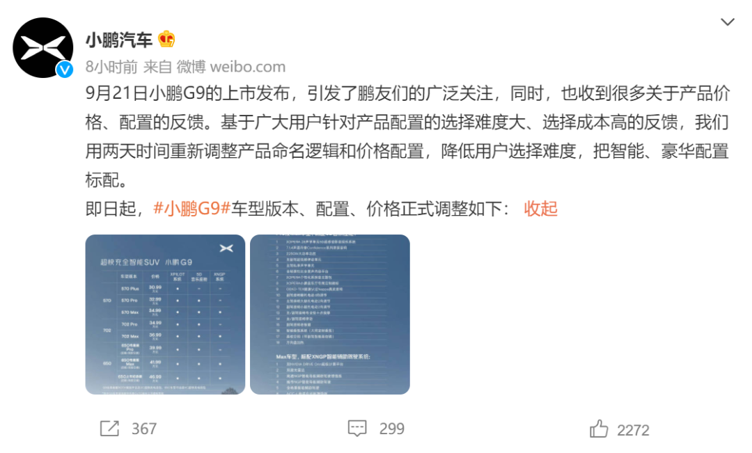 市场反应如此激昂, 以至于发布会差点沦为一场“公关危机”。 小鹏汽车不得不连夜修改SKU,9月23日发布调整公告。