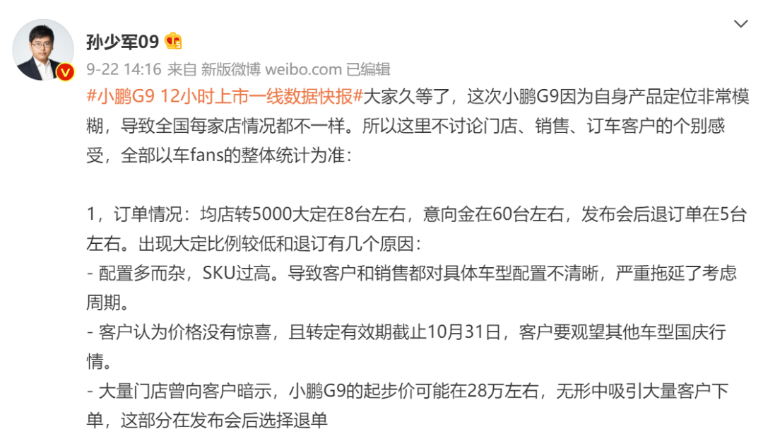 据悉,开启预订的24小时内,小鹏G9的订单量已超过2万辆。但车Fans数据,发布会后出现了不少退订单。