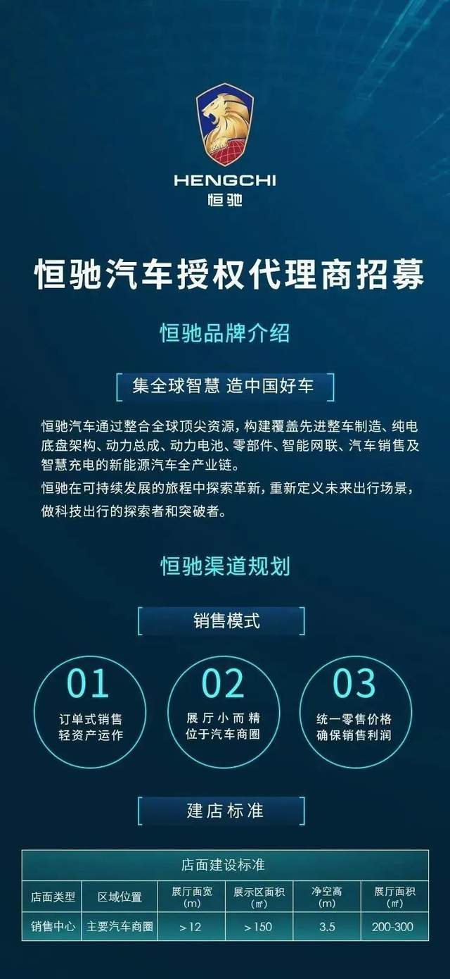 恒驰汽车的销售模式具体包括三方面内容:订单式销售轻资产运作,要求展厅小而精,统一零售价格确保销售利润。此外,对代理商资质的要求方面,恒驰还提到了企业的注册资金不低于500万元,且要有足够的资金实力。