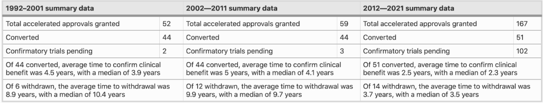 很大程度上,加速批准是成功的,一半的加速批准项目在3.2年的中位时间内转为完全批准。但在近十年,伴随着加速批准获批的飞速上涨,确证性实验不明确的市场产品也爆炸性增长——从2002年到2011年期间的仅3例,增长至近10年的102例。