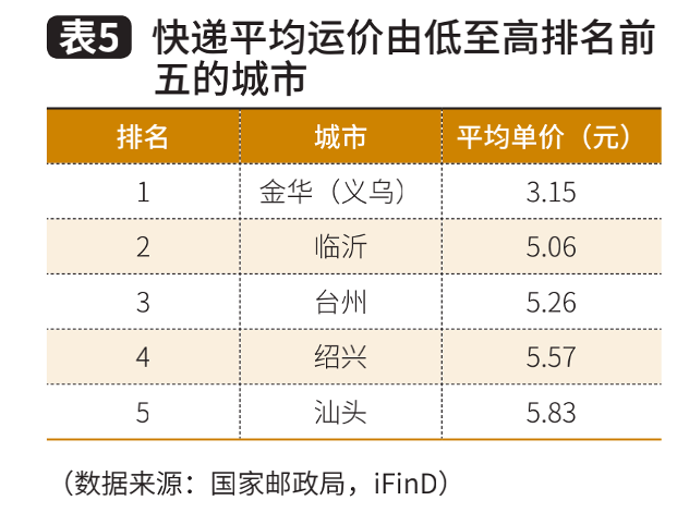 国家邮政局数据显示,在全国业务量排名前50的城市中,运价最低的城市是金华(义乌),作为“制造业大工厂”,金华(义乌)市场是各大快递企业的必争之地,平均运价仅为3.15元。