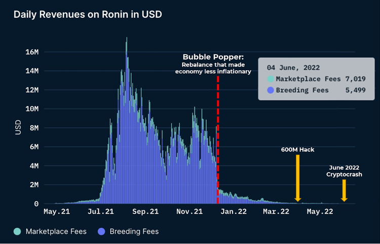 GameFi的代表产品之一「Axie infinity」就是如此,游戏设计本是长线的,但随着游戏内经济问题不断出现,收益不断下降,引发大规模玩家和价值外流,仍留在游戏内的玩家收益也受到影响,这导致游戏的日收入从均800万美元跌至仅1万美元,活跃账户从100万峰值下降到5万左右。