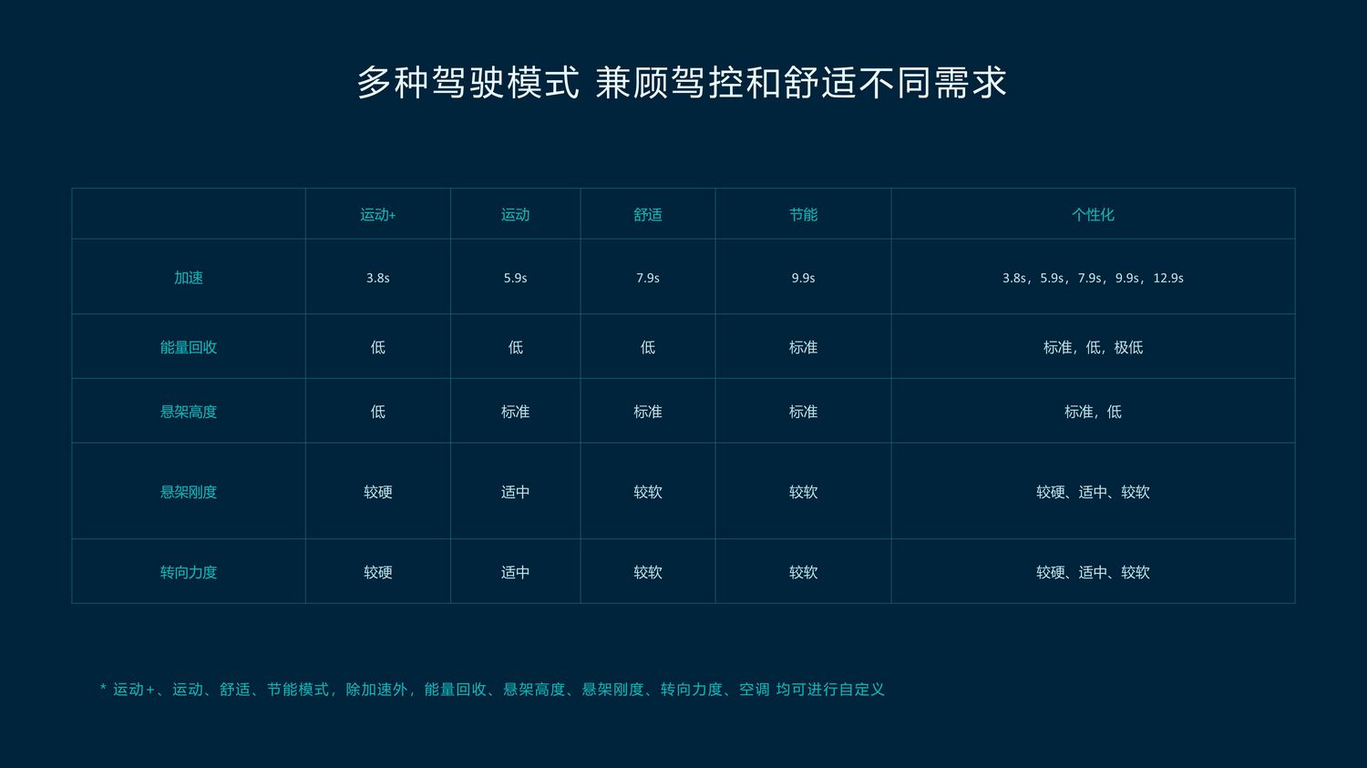 通过ICC的加持,经历轮胎、半主动-空气悬架、转向系统等大量关键部件的调校后,使得蔚来ET7拥有运动+、运动、舒适、节能四种驾驶模式。