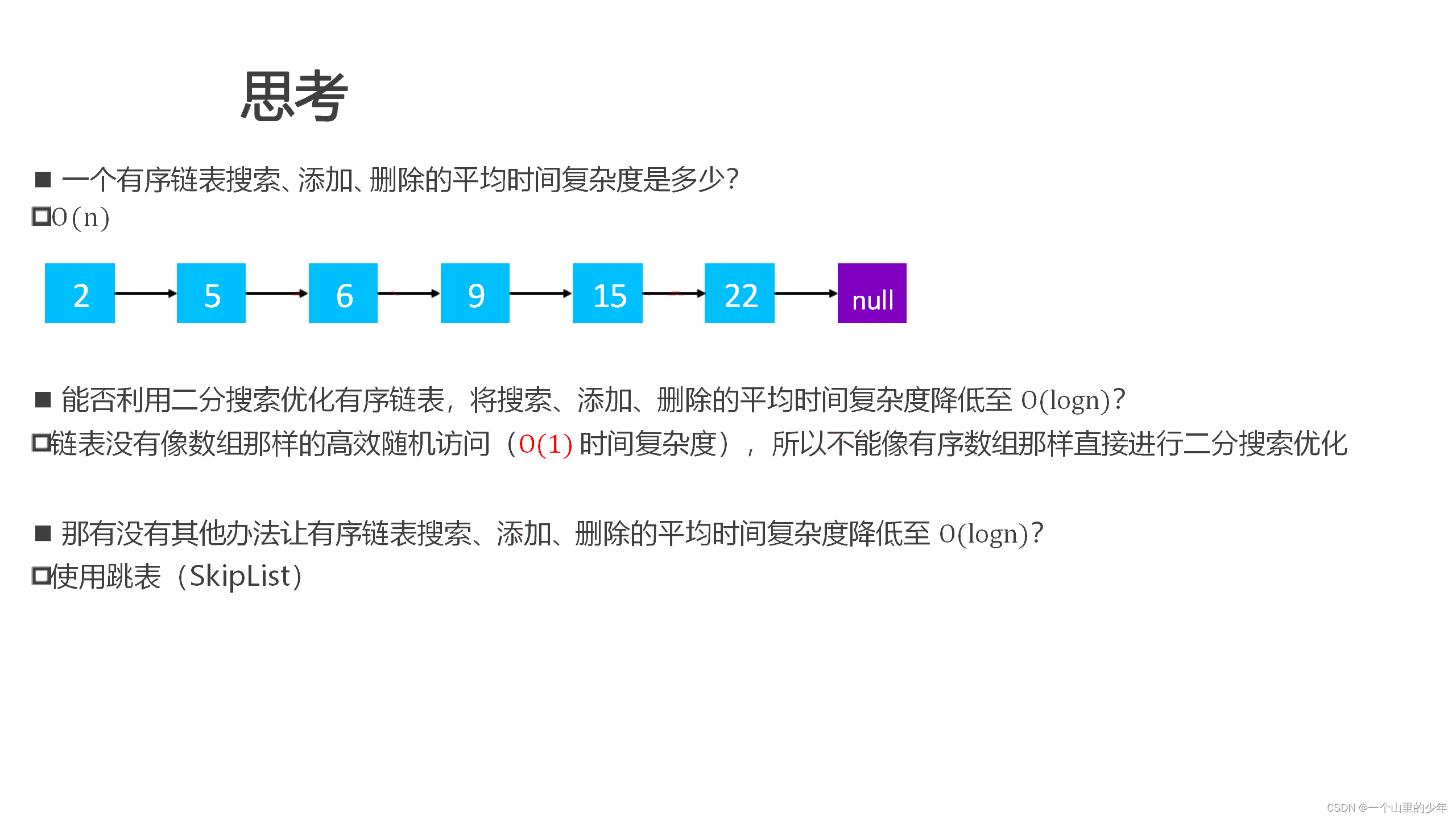那链表是否也能达到像数组那样查找一个数的时间复杂度为O(logN)?这时我们需要对链表进行升级.