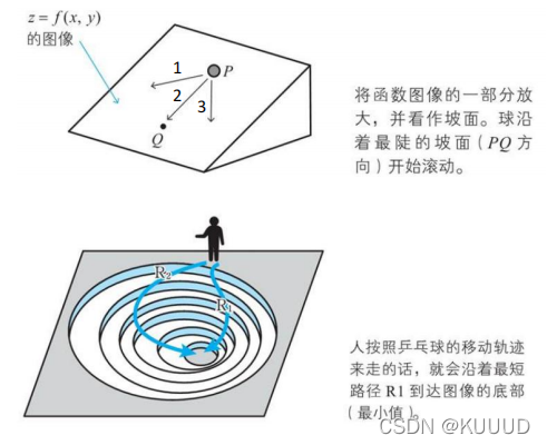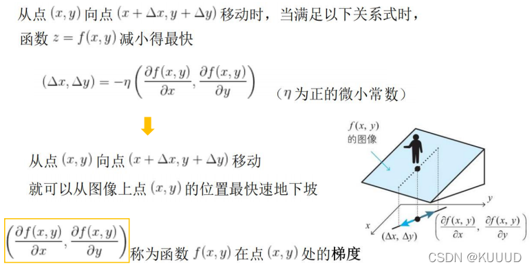 梯度下降法不直接求解上式的方程,而是通过慢慢地移动图像上的点进行摸索,从而找出函数的最小值: