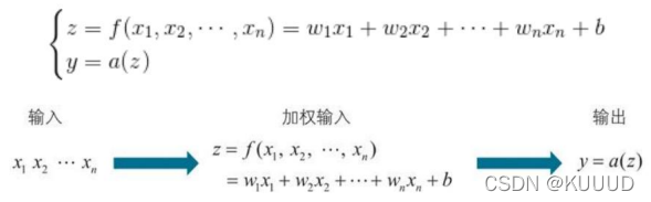 就如我们上一章所讲到的神经单元的激活函数:y = a(w1x1+w2x2+···+wnxn+b),其中w1,w2···,wn作为各输入的权重,b为神经单元的偏置,n为输入的个数。这个输出函数是如下x1,x2,···,xn的一次函数f 和激活函数a 的复合函数: