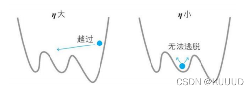 - 如果η 过大,参数就可能在迭代的过程中“越过”最低点,来回震荡,甚至无法收敛;