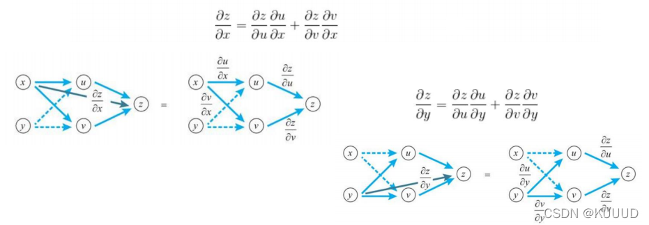 1)变量z为u,v的函数,如果u,v分别为x,y的函数,则z为x,y的函数,此时下式(多变量的链式法则)成立: