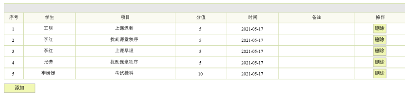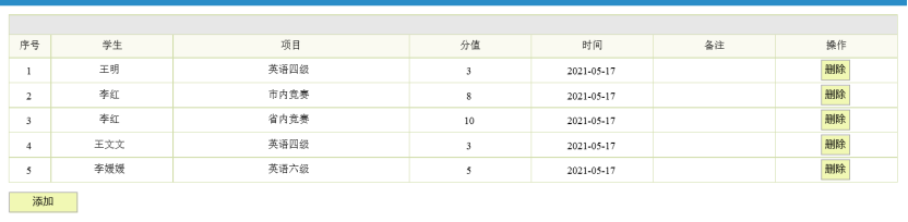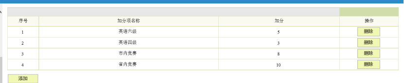 5.加分管理功能:该功能属系统管理员功能,即对所有加分信息进行管理操作,可以添加一个新的加分,也可以对已经添加的加分进行删除的操作。