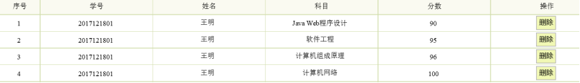 4.科目成绩管理功能:该功能属系统管理员功能,即对所有科目成绩信息进行管理操作,可以添加一个新的科目成绩,也可以对已经添加的科目成绩进行删除的操作。