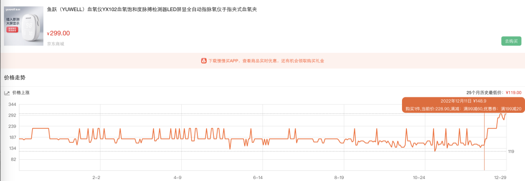 记者观察注意到,在京东平台上,鱼跃品牌的某型号血氧仪,在12月月初售价仅为137元左右,不到一个月产品售价不断飙升,月中达到此前历史最高价228元,近两天直接达到历史最高价299元,涨幅超过一倍以上。