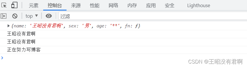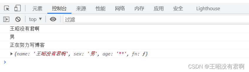 var obj = {name:'王昭没有君啊',sex:'男',age:'**', fn:function(){ console.log('正在努力写博客'); } };执行结果: