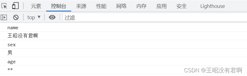 var obj = {name:'王昭没有君啊',sex:'男',age:'**'}; //循环遍历对象 for (var index in obj) { //index 存储的是obj对象的键名 console.log(index); //对象.属性不能解析变量 //这里必须使用 对象['属性'] 的方式,可以解析变量 console.log(obj[index]); }执行结果: