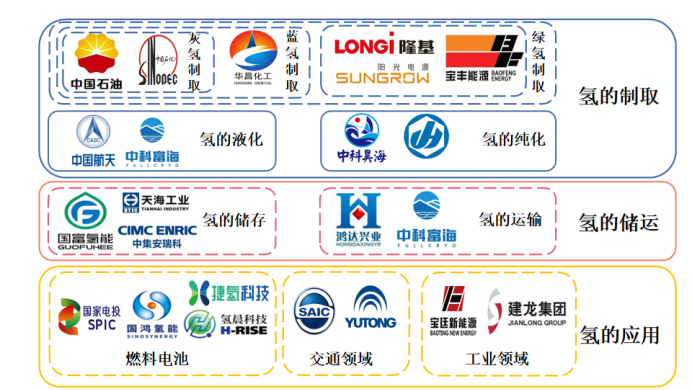 氢能产业链大致可以划分为上游(氢的制取)、中游(氢的储运)和下游(氢的应用)三个部分,产业链三个部分之间相互联系,相互影响,并且在许多细分领域都有着对应的供需关系。