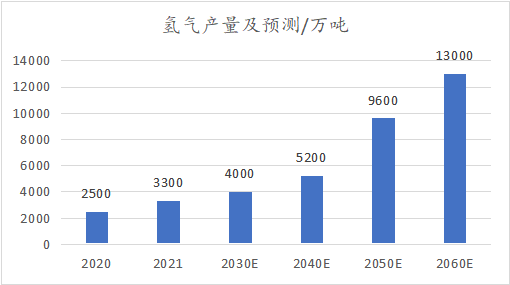 近年来,我国氢能产业发展较为迅速。2021年,中国制氢的总产量突破了3300万吨,同比增长32%,排名世界第一。中国氢能产业联盟认为,双碳目标的落实将给我国氢能产业的发展带来巨大的发展机遇,据预测,到2030年碳达峰期间,我国氢气的年需求量将达到约4000万吨,在终端能源消费中占比约为5%;到2060年碳中和的情境下,氢气的年需求量将增至约1.3亿吨,在终端能源消费中的占比约为20%,其中70%为可再生能源制氢。